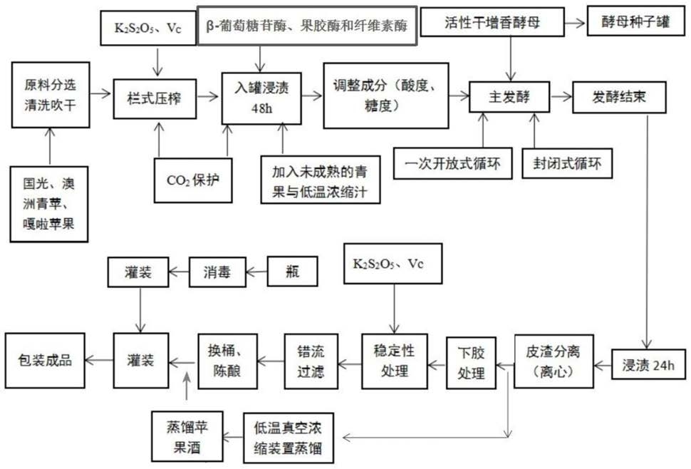 1)原料处理:将成熟的国光、澳洲青苹和嘎啦三种苹果,清洗干净后,用冷风吹干表面水份,使用栏式压榨机进行破碎,三种苹果分别破碎后按照设定比例的重量比混合压榨得苹果清汁,之后将此清汁和果渣按1:1的重量比进行混合得混汁,在破碎的过程中按50-70 mg/L的比例加入用苹果汁溶解的偏重亚硫酸钾以及20-40 mg/L的Vc,同时按每千升混汁加入0.5 kg的量充入二氧化碳气体进行保护;步骤1)中所述设定比例为国光70%、澳洲青苹