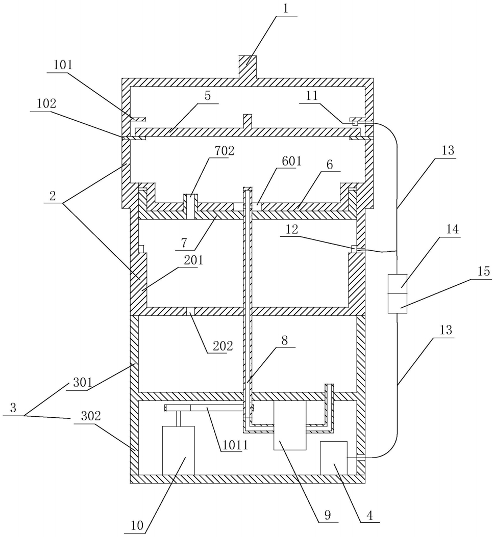 当上限长盘被顶起并最终压迫到上压力传感器时,上压力传感器向控制器发出控制信号,然后控制器控制电机开机,然后电机带动可旋转上水管旋转;