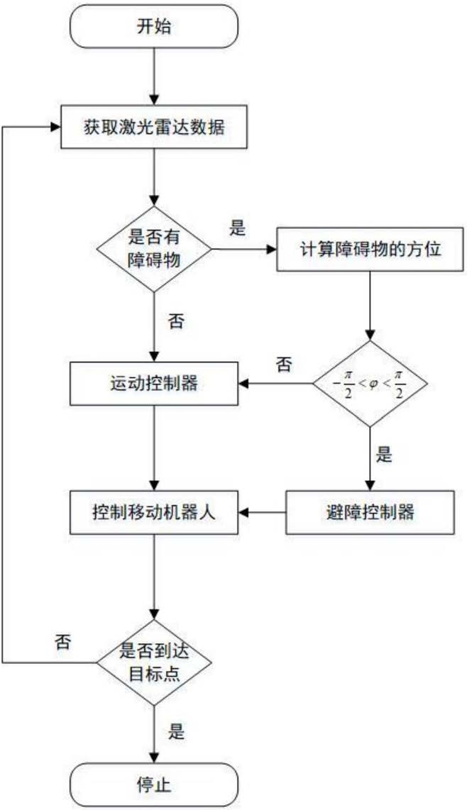 若激光雷达没有检测出障碍物,则控制移动机器人向目标点运动;运动控制器如下:ν=VmaxS(d)cosφ,