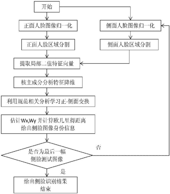 步骤D的详细过程为:通过基于核主成分分析的线性多项式和高斯内核来降低两个姿态的维数从而满足(p+q)<199这一必要条件,使用199个采集于FERET数据库中的人脸样本来学习正面-侧面变换并对Wx和Wy进行估计,并且将待检测脸部图像的正面部分和侧脸部分一起通过Wy和Wx投影到规范空间上进行比较;