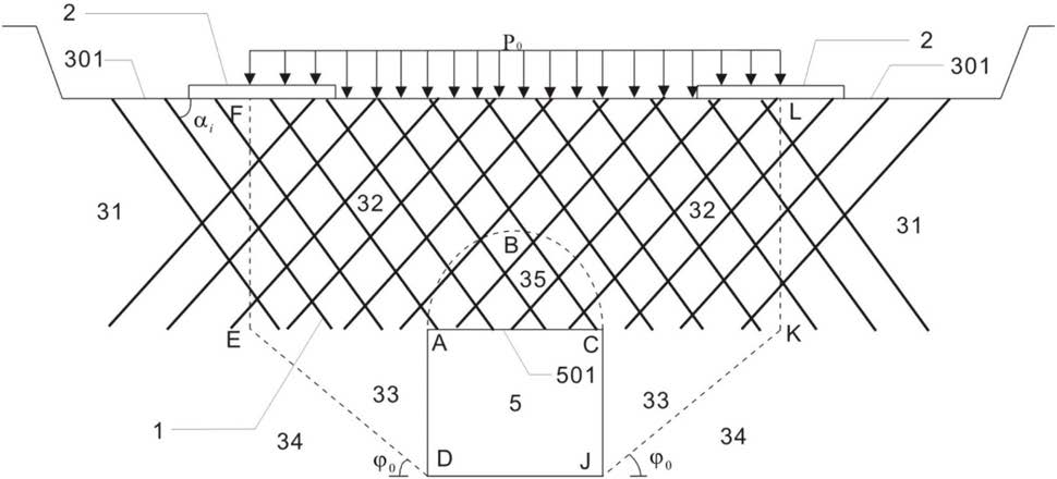 1.一种小窑采空区浅埋巷道上覆岩土斜土钉加固的方法,该方法包括采用斜土钉(1)或者斜土钉(1)与混凝土面层(2)的联合体加固小窑采空区浅埋巷道上覆岩土(31、32、35),对浅埋巷道(5)的上覆岩土(32、35)和侧壁岩土(33)进行稳定性验算,其特征在于,包括如下步骤:(1)设计小窑采空区浅埋巷道上覆岩土斜土钉加固各部件构造与参数,采用斜土钉(1)加固浅埋巷道(5)的上覆岩土(31、32、35),防止破裂面DEF、破裂面JKL内侧的岩土和自然拱ABC下的岩土失稳,破裂面DEF包括倾斜破裂面DE和竖直破裂面EF,破裂面JKL包括倾斜破裂面JK和竖直破裂面KL,斜土钉(1)为直线形状,斜土钉(1)与水平面的夹角为αi,斜土钉(1)的垂直位置从基坑底面(301)的高度到浅埋巷道顶面(501)的高度,斜土钉(1)必然穿过破裂面DEF或破裂面JKL或自然拱ABC三者中至少一个,在破裂面DEF与基坑底面(301)的相交处的基坑底面(301)铺有混凝土面层(2),在破裂面JKL与基坑底面(301)的相交处的基坑底面(301)铺有混凝土面层(2),基坑底面(301)作用有荷载P0,倾斜破裂面DE和倾斜破裂面JK与水平面的夹角为岩土的等效内摩擦角 等效内摩擦角的计算公式为:式中:为岩土的内摩擦角;c为岩土的黏聚力;γ为岩土的重度;yD为地面至D点或J点的深度;yE为地面至E点或K点的深度,当岩土的破裂面EF或岩土的破裂面KL至基坑底面(301)之间斜土钉(1)满足式(1)时,不做混凝土面层(2),当岩土的破裂面EF或岩土的破裂面KL至基坑底面(301)之间斜土钉(1)不满足式(1)时,做混凝土面层(2),若做混凝土面层(2),当斜土钉(1)在岩土的破裂面EF或岩土的破裂面KL处为受拉时,岩土的破裂面EF或岩土的破裂面KL至混凝土面层(2)之间的斜土钉(1)满足式(2)为安全;当斜土钉(1)在岩土的破裂面EF或岩土的破裂面KL处为受压时,岩土的破裂面EF或岩土的破裂面KL至混凝土面层(2)之间的斜土钉(1)满足式(3)为安全,πdi∑qsjklij≥1.4Tik (1)