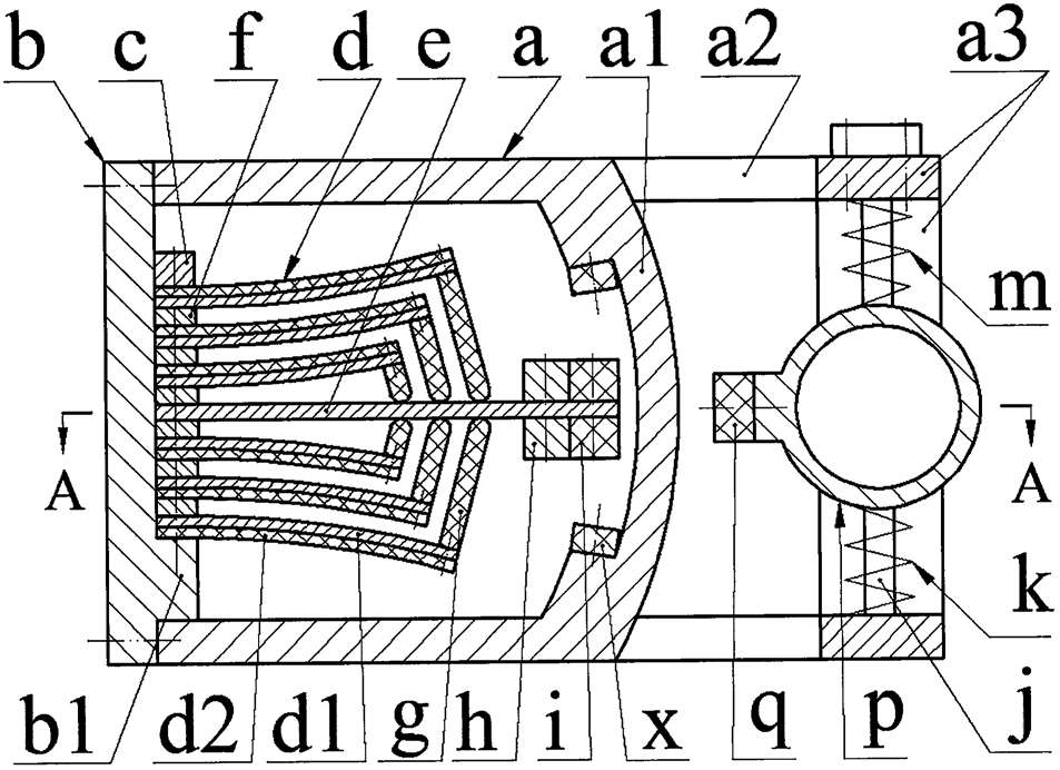 1.一种河流监测系统用自供电装置,其特征在于:壳体的侧壁端部经螺钉安装有端盖,壳体底壁的外侧为圆弧面,壳体底壁的内侧安装有限位磁铁、外侧设有4个耳板,4个耳板的端部经横梁两两相连;端盖的凸台上经螺钉及压板安装有压电振子和激励簧片,激励簧片两侧压电振子的数量相等,激励簧片与其相邻的压电振子的固定端之间、以及两个相邻压电振子的固定端之间压接有垫片;压电振子由基板和压电晶片粘接而成,压电振子自由端经螺钉安装有顶块,顶块位于基板一侧,顶块顶靠在激励簧片上,激励簧片自由端经螺钉安装有质量块和被激磁铁;销轴两端分别固定在两个相互平行的横梁上,销轴自下而上依次套有平衡弹簧、钝体和限位弹簧,钝体为中空结构,钝体上经螺钉安装有激励磁铁,被激磁铁与激励磁铁相互吸引、与限位磁铁相互排斥。