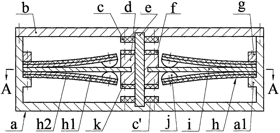 1.一种低频车载振动发电机,其特征在于:安装有限位磁铁的端盖安装在壳体上,套有质量块的方形导柱上下两端分别镶嵌在端盖和壳体的底壁上,质量块上下两侧分别安装有动磁铁一和动磁铁二;壳体的底壁上安装有悬浮磁铁,悬浮磁铁和限位磁铁套在方形导柱上;动磁铁一与动磁铁二的异性磁极相对安装,动磁铁一与限位磁铁的同性磁极相对安装,动磁铁二与悬浮磁铁的同性磁极相对安装;壳体的左右侧壁上都设有凸台,凸台上安装有压电振子和弹簧片;弹簧片两侧压电振子数量相等,压电振子由基板和压电片粘接而成,基板靠近弹簧片安装;压电振子自由端安装有顶块,顶块顶靠在弹簧片上,弹簧片自由端插入质量块的窄缝内;压电振子安装前为平直结构、安装后为弯曲结构;非工作时,压电片上的最大压应力为其许用压应力的一半,弹簧片不发生弯曲变形,弹簧片两侧压电振子应力分布及变形状态分别相同;动磁铁一与限位磁铁或动磁铁二与悬浮磁铁相接触时,压电振子的变形量为其许用变形量、压电片所受的最大压应力为其许用压应力。