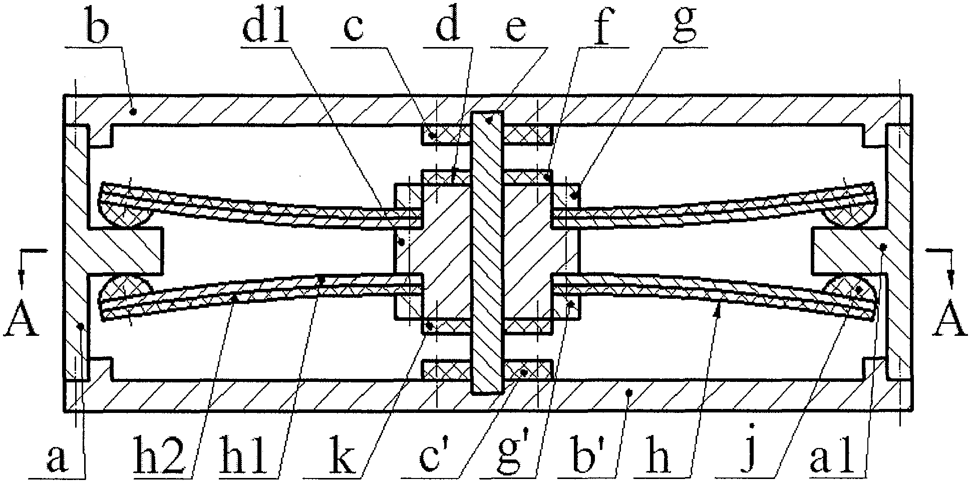 动磁铁一与动磁铁二的异性磁极相对安装,动磁铁一与限位磁铁的同性磁极相对安装,动磁铁二与悬浮磁铁的同性磁极相对安装;质量块的中部设有环形凸台,环形凸台上安装有压电振子;压电振子由基板和压电片粘接而成,基板靠近环形伸出梁安装;压电振子的自由端安装有顶块,顶块顶靠在环形伸出梁上;压电振子安装前为平直结构、安装后为弯曲结构;非工作时,压电片上的最大压应力为其许用压应力的一半,环形伸出梁两侧压电振子应力分布及变形状态分别相同;动磁铁一与限位磁铁或动磁铁二与悬浮磁铁相接触时,压电振子的变形量为其许用变形量、压电片所受的最大压应力为其许用压应力。