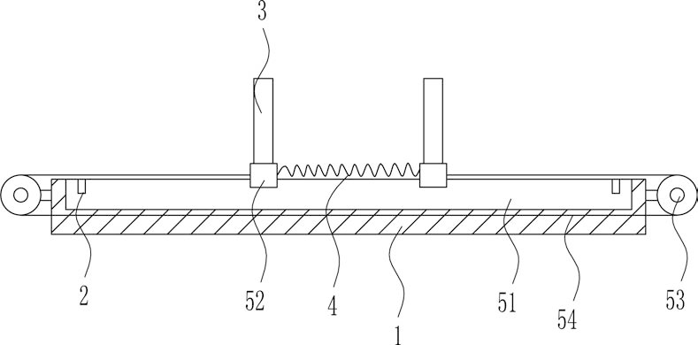 2.根据权利要求1所述的一种体育教学用趣味型比赛装置,其特征在于,移动装置(5)包括有第一滑块(52)、第一绕线轮(53)和第一拉线(54),底板(1)的顶部设有滑槽(51),滑槽(51)上滑动式设有左右对称的第一滑块(52),第一滑块(52)的顶部连接有推手(3),左右两个第一滑块(52)之间连接有第一弹簧(4),滑槽(51)内顶部的两侧设有左右对称行程开关(2),底板(1)的两侧设有左右对称的第一绕线轮(53),第一绕线轮(53)上绕有第一拉线(54),第一拉线(54)的一端与左侧第一滑块(52)的左端连接,第一拉线(54)的另一端与右侧的第一滑块(52)连接。
