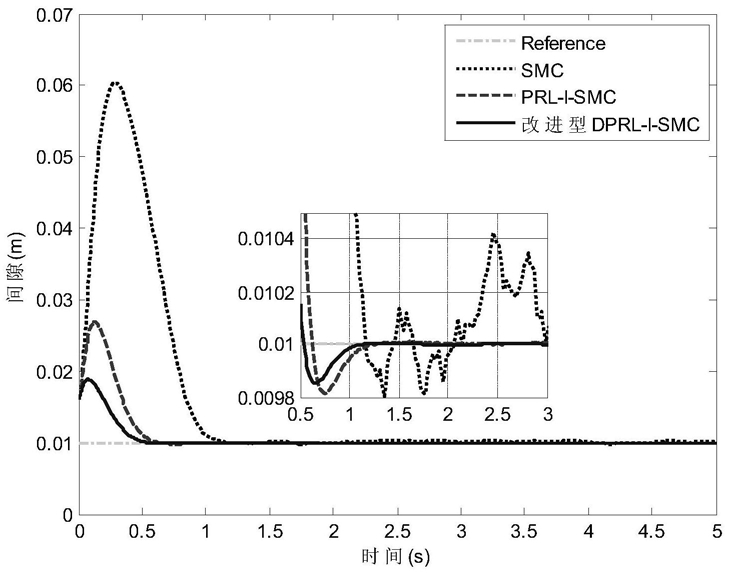 步骤2、定义改进型双幂次趋近律的积分滑模控制(DPRL-I-SMC)的滑模面及趋近律如下:取理想位置信号为xd,则误差和系统的速度误差分别为e=xd-x1, 系统的加速度误差和系统的加加速度误差分别其中, 分别为理想间距的速度,加速度和加加速度, 分别为系统输出间距的速度,加速度和加加速度;