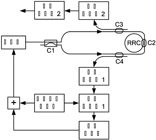 右工作光源(LD2)由光纤连接到右环行器(Cir2)的一个端口(1),右环行器(Cir2)为逆时针环行器;右环行器(Cir2)、输入耦合器(C1)、无源环形谐振腔(RRC)、输出耦合器(C2)、右分束耦合器(C4)、右环行器(Cir2)依次连接构成右工作光源(LD2)的外谐振回路,环形谐振方向为逆时针方向,其中,右环行器(Cir2)的下一个端口(2)连接输入耦合器(C1),右分束耦合器(C4)连接右环行器(Cir2)的再下一个端口(3);在右工作光源(LD2)的外谐振回路中沿谐振方向设置右隔离器(ISO2);