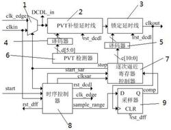 所述的PVT检测器是由9级或非门构成的环形振荡器和计数器counter构成的,在PVT补偿状态,信号switch跳变为逻辑低电平并保持参考时钟信号clkin的一个周期TD,由9级或非门构成的环形振荡器开始振荡,并有计数器counter进行计数,计数的结果保存在计数器的输出信号count[6:0]中;PVT补偿延时线中的独热码s[7:0]由PVT检测器的输出信号d[5: