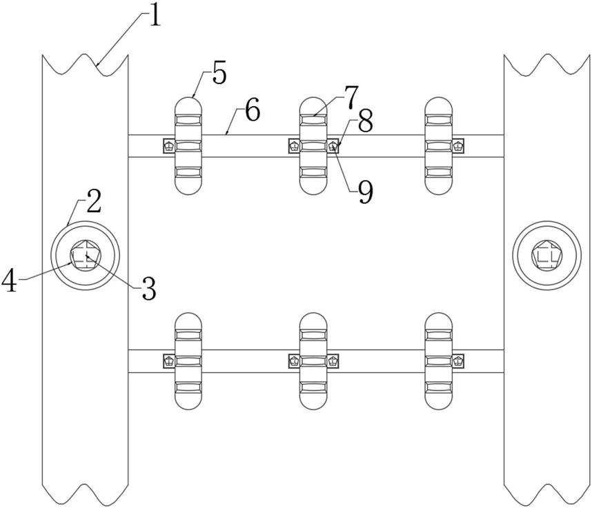 所述传动轮(5)的内壁上固定有轴承,该轴承与连接杆(6)滑动连接,且固定板(8)与轴承的内环固定连接,传动轮(5)与波纹管滑动连接,且位于连接杆(6)两端的传动轮(5)的外侧设置有固定板(8),中间的传动轮(5)两侧均设置有固定板(8);