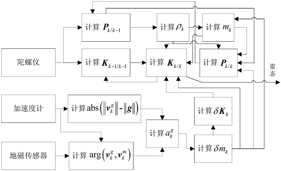 有了当前时刻的累加权值和mk和加权因子ρk,就可以实现对姿态的修正,即得到矩阵Kk/k,最后计算当前时刻的姿态验后估计误差的协方差矩阵Pk/k,保存Pk/k和mk,以便于进行下一轮的计算;