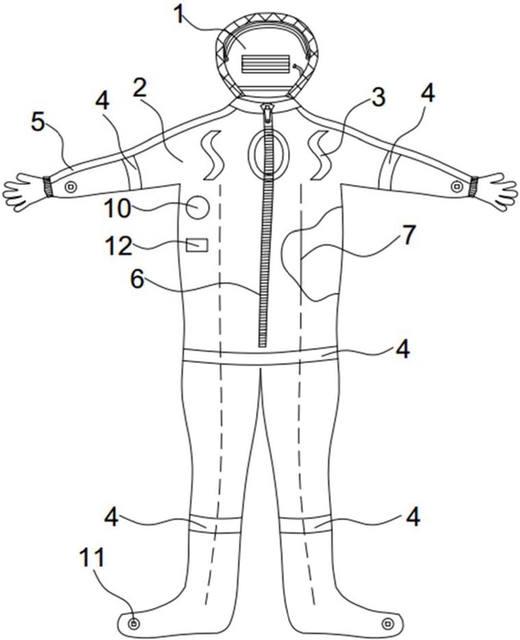 1.一种船用智能救生衣,包括衣体(2),与衣体(2)连通的头垫(1),其特征在于,所述衣体(2)为由前襟、后背、袖子和裤腿组成的一体式衣服形状,所述衣体(2)前襟上端设有SOS发光体(3),所述衣体(2)前襟中部设有防水拉链(6),所述衣体(2)前襟上端一侧设有充气按钮(10)和加热按钮(12),所述衣体(2)的袖子上端设有臂灯(5),所述衣体(2)内部嵌有加热件、气体发生机构(9)和供电控制模块(13),所述衣体(2)和头垫(1)材料包括密封面料(201)、充气腔和泡沫内芯(401)。