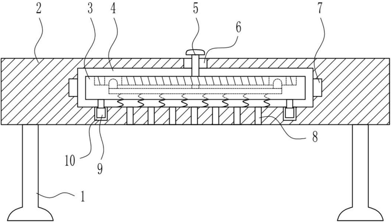 1.一种存储卡集成电路测试用测试台,其特征在于,包括有支撑柱(1)、工作板(2)、放置装置(3)、固定装置(5)、感应器(7)和滚动轮(9),工作板(2)顶部设置有通孔(6),工作板(2)中部设置有第一凹槽(4),第一凹槽(4)内设置有放置装置(3),放置装置(3)底部左右对称式设置有滚动轮(9),放置装置(3)后侧连接有固定装置(5),固定装置(5)穿过通孔(6),工作板(2)底部均匀设置有透气孔(8),透气孔(8)位于第一凹槽(4)下方,透气孔(8)与第一凹槽(4)连通,工作板(2)底部左右对称式设置有第二凹槽(10),第二凹槽(10)位于第一凹槽(4)下方,第二凹槽(10)位于透气孔(8)两侧,左侧的滚动轮(9)位于左侧的第二凹槽(10)内,右侧的滚动轮(9)位于右侧的第二凹槽(10)内,工作板(2)内左右两侧对称式设置有感应器(7),感应器(7)位于第一凹槽(4)两侧,左侧的工作板(2)底壁左右两侧和前后两侧均对称式设置有支撑柱(1)。