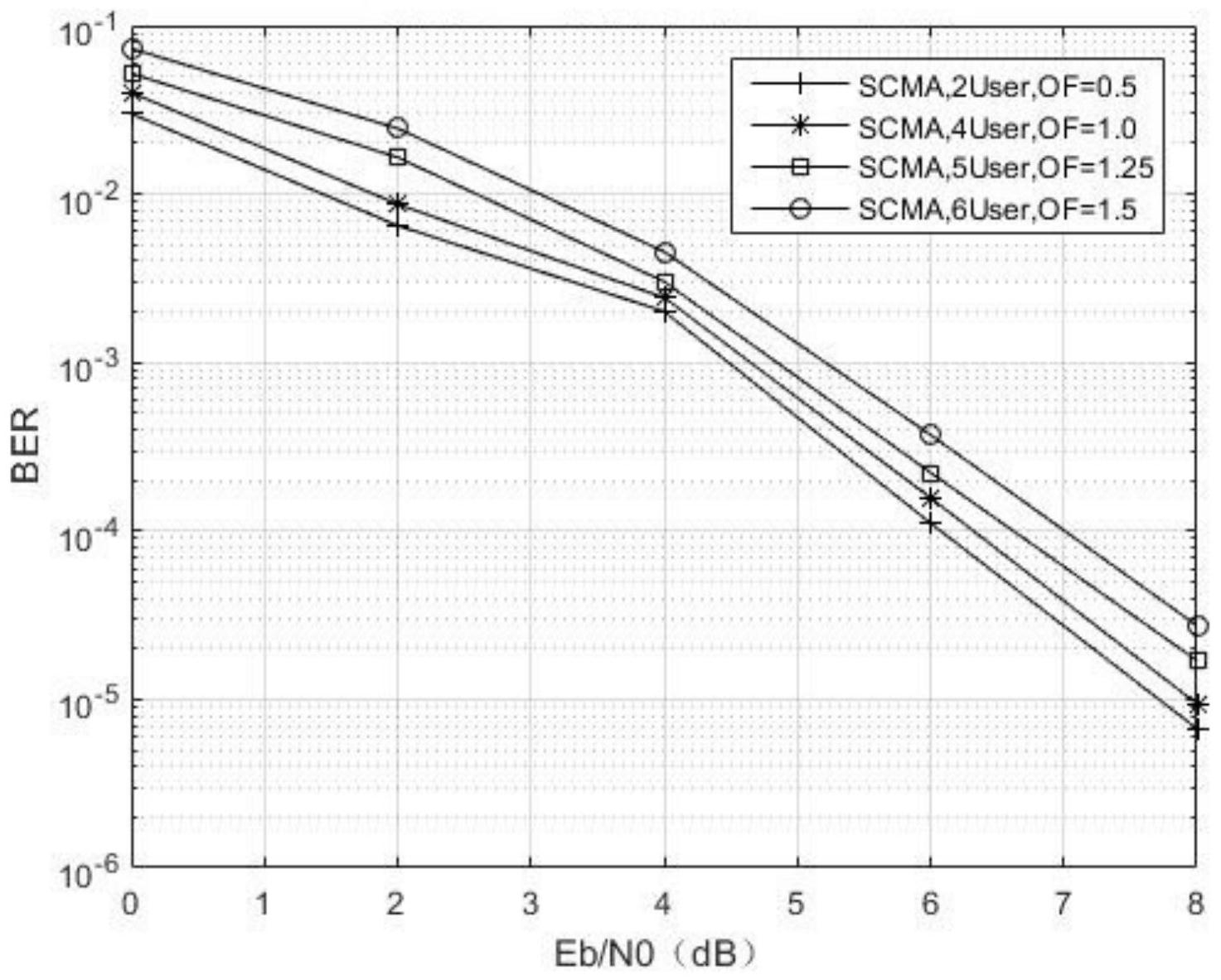 S2、定义M为数字信号调制方式的数值,选取一种数字信号调制方式对应一个M,计算OFDMA系统中的检测算法复杂度为N*M,SCMA系统中多用户检测算法复杂度为 其中,df=N-1;