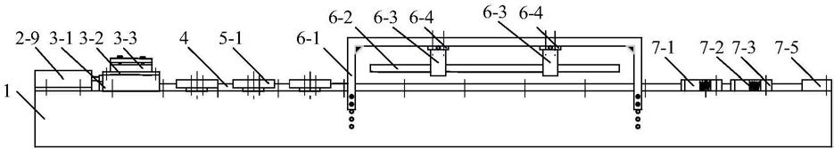 所述的永磁体(6-7)均匀排列吸附在轭铁(6-6)表面,永磁体(6-7)间隔处设有永磁体隔板(6-8),永磁体(6-7)的两侧通过永磁体固定块(6-5)夹紧,轭铁(6-6)、永磁体固定块(6-5)、永磁体(6-7)、永磁体隔板(6-8)均紧固在永磁体固定支架(6-2)的凹槽中,永磁体固定支架(6-2)通过螺纹连接与永磁体调整架(6-3)固定在一起,永磁体调整架(6-3)与双向丝杠滑台(6-4)螺纹连接,双向丝杠滑台(6-4)能通过螺纹副调节导轨(4)两侧的两个永磁体固定支架(6-2)之间的距离,双向丝杠滑台(6-4)通过螺纹连接固定在缓速器支架(6-1)上,缓速器支架(6-1)通过螺纹连接固定在试验台支架(1)上,试验台支架(1)上有四列高度不同的螺纹孔用于调节缓速器支架(6-1)的安装高度,当运动小车穿过永磁缓速装置后变为速度减V3;
