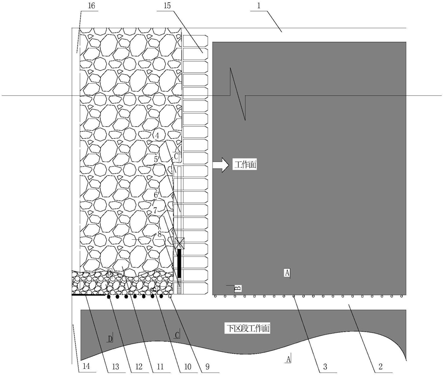 f.随着工作面的不断推进,重复步骤b~e多次,形成作为下一个工作面使用的巷旁支护体,实现Y型通风和无煤柱开采。
