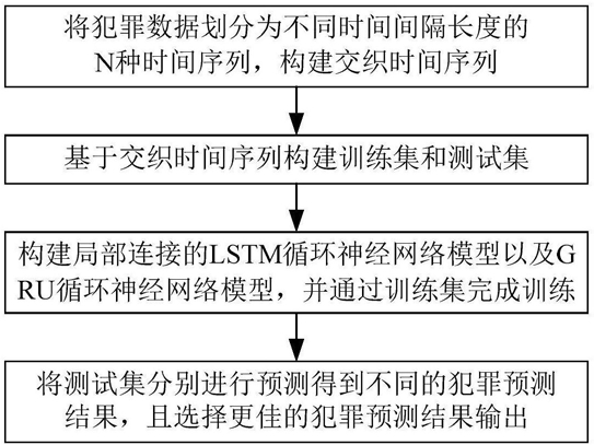 1.一种基于交织时间序列局部连接循环神经网络的犯罪预测方法,其特征在于实施步骤包括:1)将犯罪数据划分为不同时间间隔长度的N种时间序列,在相同的时间间隔序列重采样,不同的时间间隔不要重采样,预测日期被称为时间点且作为N种时间序列的交叉点,得到犯罪数据对应的交织时间序列;2)基于交织时间序列构建训练集和测试集;3)分别构建局部连接的LSTM循环神经网络模型以及GRU循环神经网络模型,并通过训练集完成对局部连接的LSTM循环神经网络模型以及GRU循环神经网络模型的训练;4)将测试集分别输入完成训练的局部连接的LSTM循环神经网络模型以及GRU循环神经网络模型,分别得到不同的犯罪预测结果,且选择更佳的犯罪预测结果输出。2.根据权利要求1所述的基于交织时间序列局部连接循环神经网络的犯罪预测方法,其特征在于,步骤3)中分别构建局部连接的LSTM循环神经网络模型以及GRU循环神经网络模型的详细步骤包括:3.1)建立LSTM循环神经网络模型以及GRU循环神经网络模型;3.2)分别将LSTM循环神经网络模型以及GRU循环神经网络模型设置为N个局部连接组成方式构建循环神经网络,且对N种时间序列构建N个独立的隐藏层,在输出层之前建立汇总层,最终构建得到局部连接的LSTM循环神经网络模型以及GRU循环神经网络模型。3.根据权利要求2所述的基于交织时间序列局部连接循环神经网络的犯罪预测方法,其特征为,步骤3.1)中LSTM循环神经网络模型的函数表达式如式(1)所示;式(1)中,ft为遗忘门,σ为Sigma函数,Wfh和Wfx为权值,ht-1为上一个短期状态值,xt为输入的犯罪次数,bf为偏置值,it为输入门,Wi为权值,bi为偏置值,为长期状态估计值,Wc为