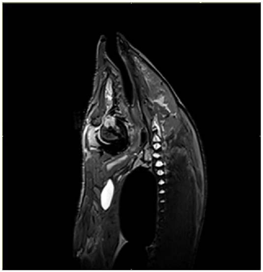 2.根据权利要求1所述的一种将鲤鱼磁共振扫描坐标转换为脑立体定位坐标的方法,其特征在于:步骤5中,将鲤鱼固定在磁共振成像仪的膝关节线圈内,鲤鱼呈俯卧位、头先进,进床前使磁共振扫描十字线对准颅脑中心;然后在定位项图像中确定矢状位扫描平面,扫描时,矢状位扫描平面与YOZ平面平行,矢状位成像MR获取方式为3D,成像序列选用T2WI快速自旋回波扫描序列,重复时间TR=750ms,回波时间TE=112ms,层厚=0.8mm,层数=