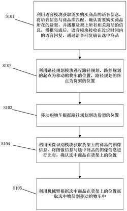 利用语音模块获取需要购买商品的语音信息,将所述语音信息与商品库匹配,确认所述需要购买商品所在的货架,并播报所述货架上所有相关商品的信息,播报完成后,所述语音模块接收在设定时间内的语音回复,通过所述语音回复确认选中商品;
