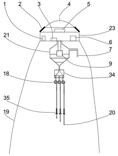 3.根据权利要求1所述的一种抗风浪海洋分层多参数水质监测浮标,其特征在于:所述数据采集传输箱(23)顶部设有天线(4),底部下端设有水质仪(9),内部设有采集模块(3)、信号传输模块(1)、控制模块(6)以及电池组(5);所述天线(4)与信号传输模块(1)相连;所述水质仪(9)位于储水箱(21)内,与控制模块(6)相连;所述采集模块(3)与控制模块(6)和信号传输模块(1)相连;所述信号传输模块(1)与采集模块(3)、天线(4)以及控制模块(6)相连;所述控制模块(6)与采集模块(3)、信号传输模块(1)、水泵、电磁阀以及水质仪(9)连接;