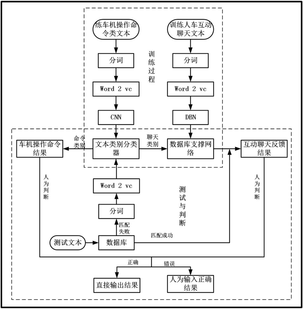 7.根据权利要求1所述的一种基于数据库与神经网络的车机自然语言人机交互算法,其特征在于:在所述步骤S6之后还包括步骤:将互动聊天测试文本输入S1中搭建的数据库中进行匹配,若匹配成功,则输出相应的互动反馈信息;若匹配失败,则将文本信息通过S2与S3输入S4中训练好的文本类别分类器进行分类,并反馈结果;若分类结果属于车机操作控制命令,则直接输出控制结果;若属于互动类别,则将其输入S6中训练好的深度置信数据库支撑网络,得到人车互动聊天结果。