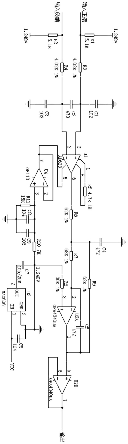 1.一种基于K型热电偶的温度测量电路,其特征在于:包括放大器芯片U1、第一运放芯片U2A、第二运放芯片U2B、第一电压转换芯片U3、第二电压转换芯片U4、第一偏置电阻R1、第二偏置电阻R2、第一高精度电阻R3、第二高精度电阻R4、第三高精度电阻R5、第四高精度电阻R6、第五高精度电阻R7、第六高精度电阻R8、第七高精度电阻R9、第一分压电阻R10、第二分压电阻R11、第一电容C1、第二电容C2、第三电容C3、第四电容C4、第五电容C5、第六电容C6、第七电容C7、第八电容C8和第九电容C9;其中,放大器芯片U1的第一管脚1连接第三高精度电阻R5,第三高精度电阻R5另一端连接放大器芯片U1的第八管脚8;第一电容C1的一端接地、另一端接第二电容C2,第二电容C2的另一端连接第三电容C3,第三电容C3的另一端接地;第一电容C1与第二电容C2相连的一端接第一高精度电阻R3,第三电容C3与第二电容C2相连的一端接第二高精度电阻R4,第一高精度电阻R3的另一端连接第一偏置电阻R1,第二高精度电阻R4的另一端连接第二偏置电阻R2,第一偏置电阻R1与第二偏置电阻R2的另一端均接偏置电压V1,第一偏置电阻R1与第一高精度电阻R3相接的部分为热电偶信号的输入正端,第二偏置电阻R2与第二高精度电阻R4相接的部分为热电偶信号的输入负端;放大器芯片U1的第三管脚3连接第一电容C1与第二电容C2的相接处,放大器芯片U1的第二管脚2连接第三电容C3与第二电容C2的相接处,放大器芯片U1的第五管脚5接基准电压V2,放大器芯片U1的第六管脚6连接第四高精度电阻R6,第四高精度电阻R6的另一端连接第四电容C4、第五高精度电阻R7与第七高精度电阻R9,第四电容C4的另一端接地;第七高精度电阻R9的另一端接第一运放芯片U2A的第一管脚1,第五高精度电阻R7的另一端接第一运放芯片U2A的第二管脚2,第六高精度电阻R8的一端接第一运放芯片U2A的第三管脚3、另一端接偏置电压V1;第五电容C5的一端接第一运放芯片U2A的第一管脚1、另一端接第一运放芯片U2A的第二管脚2;第二运放芯片U2B的第六管脚6与第七管脚7相接,第一运放芯片U2A的第一管脚1与第二运放芯片U2B的第五管脚5相接,第二运放芯片U2B的第七管脚7为信号的输出端;第六电容C6的一端接第一电压转换芯片U3的第一管脚1、另一端接第一电压转换芯片U3的第三管脚3,第七电容C7的一端接第一电压转换芯片U3的第二管脚2、另一端接第一电压转换芯片U3的第三管脚3,第一电压转换芯片U3的第一管脚1接5V电压、第三管脚3接地、第二管脚2为偏置电压V1的输出端;第二分压电阻R11、第八电容C8与第九电容C9并联,且并联的一端接第二电压转换芯片U4的第三管脚3,并联的另一端接地,第一分压电阻R10的一端接第二电压转换芯片U4的第三管脚3、另一端接偏置电压V1,第二电压转换芯片U4的第二管脚2与其第六管脚6相接,第二电压转换芯片U4的第六管脚6为基准电压V2的输出端。
