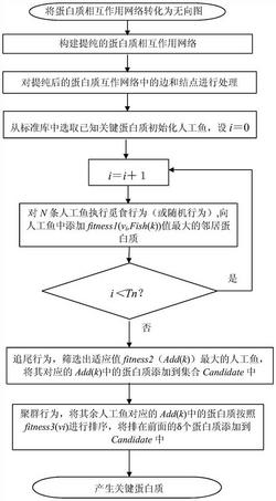 1.基于人工鱼群优化算法识别关键蛋白质的方法,其特征在于:包括以下步骤:(1)将蛋白质相互作用网络转化为无向图:将蛋白质相互作用网络转化成一个无向图G=(V,E),其中,V={vi,i=1,2,…,n}为结点vi的集合,E为边e的集合,结点vi表示蛋白质,边e表示蛋白质之间的相互作用;