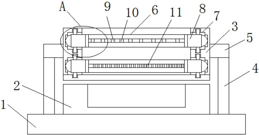 5.根据权利要求1所述的一种具备分级筛选功能的膨润土生产设备,其特征在于,所述龙门架(6)内固定套设有支撑板(9),位于上方龙门架(6)内的支撑板(9)的顶部开设有第一筛选孔(10),位于下方龙门架(6)内的支撑板(9)的顶部开设有第二筛选孔(11),且第一筛选孔(10)的径长大于第二筛选孔(11)的径长。
