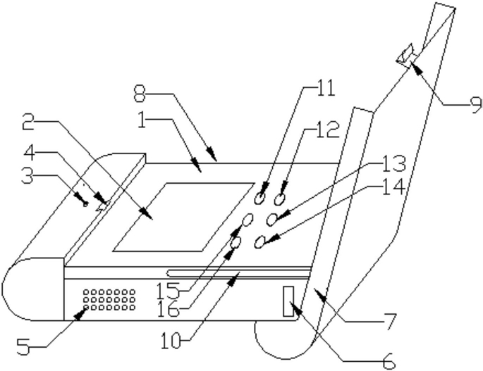 1.一种数字录像机,包括装置本体(1),其特征在于:所述装置本体(1)的顶部设有外壳(8),所述外壳(8)与所述装置本体(1)紧密连接,所述外壳(8)的一侧设有前置摄像头(3),所述前置摄像头(3)与所述外壳(8)紧密连接,所述前置摄像头(3)的底部设有后置摄像头(17),所述后置摄像头(17)与所述外壳(8)紧密连接,所述后置摄像头(17)的一侧设有锁孔(4),所述锁孔(4)与所述外壳(8)紧密连接,所述锁孔(4)的一侧设有主屏幕(2),所述主屏幕(2)与所述外壳(8)紧密连接,所述主屏幕(2)的一侧设有凹槽(10),所述凹槽(10)的一侧设有屏幕保护盖(7),所述屏幕保护盖(7)的顶部设有锁扣(9),所述锁扣(9)与所述屏幕保护盖(7)紧密连接,所述主屏幕(2)的一侧设有主屏幕开关(15),所述主屏幕开关(15)的一侧设有后置摄像头开关(16),所述后置摄像头开关(16)的一侧设有前置摄像头开关(14),所述前置摄像头开关(14)的一侧设有WIFI接收器开关(13),WIFI收发器开关(13)的一侧设有蓝牙设备开关(12),所述蓝牙设备开关(12)的一侧设有红外收发器开关(11),所述主屏幕开关(15)、所述WIFI接收器开关(13)、所述蓝牙设备开关(12)和所述红外收发器开关(11)均与控制板(20)电性连接,所述后置摄像头(17)的一侧设有激光光源(18),所述激光光源(18)与所述外壳(8)紧密连接,且所述激光光源(18)与所述控制板(20)电性连接,所述激光光源(18)的底部设有电池板(19),所述电池板(19)与所述控制板(20)电性连接。