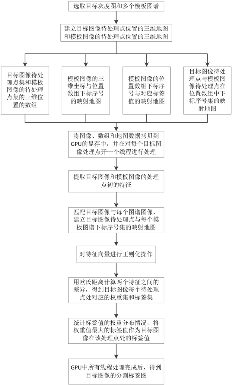 步骤(3):将目标图像的灰度图、n个模板图谱、位置数组、映射地图Ⅰ、映射地图Ⅱ和映射地图Ⅲ拷贝到GPU显存中,然后在GPU中进行分割计算,GPU开启目标图像待处理点数目个线程,进行大数据处理:根据目标图像待处理点和模板图谱待处理点的位置数组,得到一个目标图像待处理点集的所有特征向量集合和每个模板图谱待处理点集的所有特征向量集合;考虑到每个模板图谱的不同特征和分割特性,需要对每个模板图谱的映射地图Ⅲ进行匹配数据的筛选,得到一张新的目标图像待处理点与每个模板图谱下标序号集的映射地图IV;接着计算目标图像每个待处理点处对应的权重集和标签集;统计目标图像待处理点可能匹配的每个标签值的权重分布情况,将最大权重对应的标签值作为目标图像待处理点的分割结果,最终得到了目标图像的分割。
