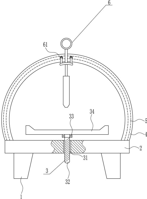 2.根据权利要求1所述的一种高安全性西瓜切割装置,其特征在于,放置装置(3)包括有第一螺杆(32)、轴承(33)和放置板(34),底座(2)左部开有第一螺纹孔(31),第一螺纹孔(31)内竖直设有第一螺杆(32),底座(2)上方水平设有放置板(34),放置板(34)底部中间通过螺栓连接的方式安装有轴承(33),第一螺杆(32)顶端位于轴承(33)内,第一螺杆(32)与轴承(33)内通过过盈方式配合连接。