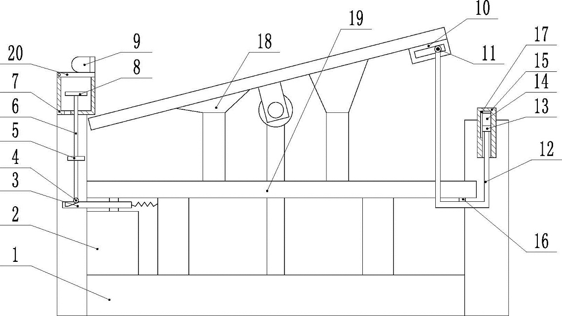 1.太阳能式路灯,包括路灯杆和太阳能板,路灯杆上设置有基座,太阳能板设置在基座上,其特征在于,太阳能板自西向东向上倾斜地铰接在基座上,太阳能板和基座的连接处设置有第一扭簧,基座上固定有导向槽,导向槽内固定有受热膨胀块,导向槽和受热膨胀块之间设置有位于受热膨胀块西方及上方的倒L形隔热板,受热膨胀块底部相抵有活塞,太阳能板东侧的底部上设置有滑槽,滑槽内滑动连接有滚轴,滚轴和活塞之间连接有连杆;所述太阳能板下方的基座上固定有内部中空的通气板,通气板连通有连通管,连通管远离通气板的一端连通有内部为负压的负压箱,连通管内插有用于封闭连通管的插杆,插杆的一端上开有楔槽,基座上固定有带有螺纹孔的固定块,固定块内螺纹连接有螺杆,螺杆的一端固定连接有球块,球块与楔槽内楔面相抵,螺杆的另一端固定连接有风轮,通气板上连通有用于吸附太阳能板的弹性负压盘;