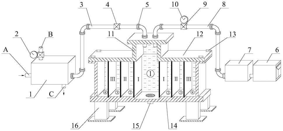 2.3:当注浆量达到要求时,关闭控浆阀门,依次仅打开第二至第四腔室下方的泻流口其中之一,通过控制空压机的空气压力对主腔室内的浆液进行加载,使得浆液在空气压力的作用下侧向渗透扩散到第二至第四腔室的土体中,通过依次研究第二至第四泻流口出浆的浆液浓度,分析浆液扩散过程中的滤过特性;加载完毕后打开顶盖,取出注浆土体,研究浆液的扩散情况对土体的加固作用;