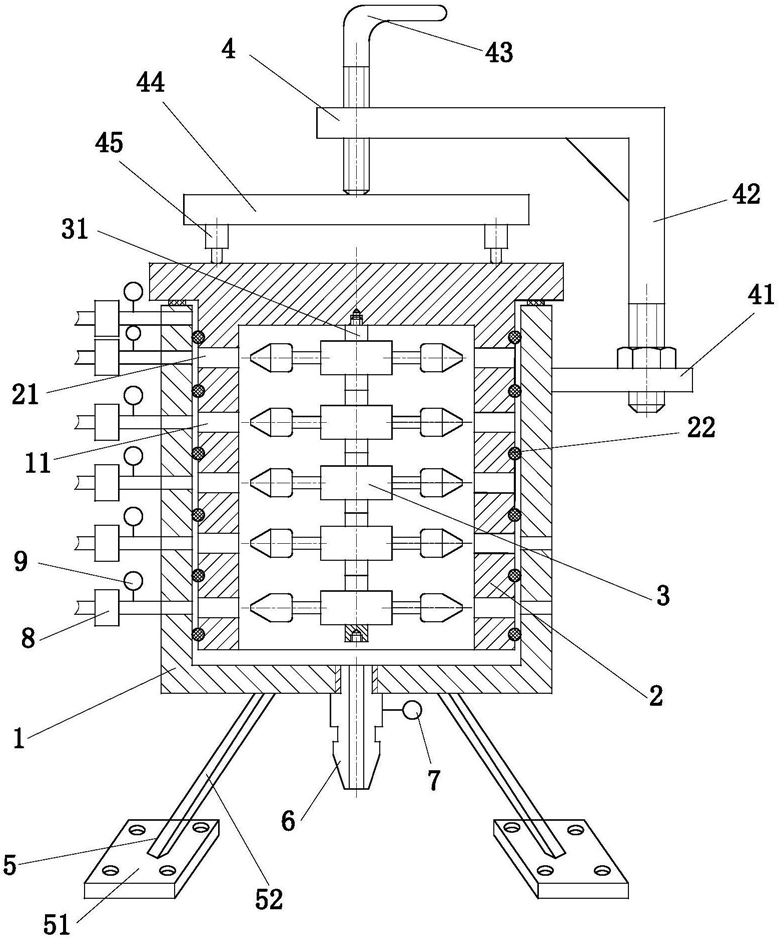 1.一种密封圈非破坏性额定压力检测仪器,其特征在于:包括外壳(1)、试压轴(2)、堵塞模块(3)、压紧模块(4)、支座(5)、快速接头(6)、压力表一(7)、电磁阀(8)、压力表二(9)和卸油管,所述支座(5)包括底板(51)和支撑架(52),所述底板(51)安装于地面,所述支撑架(52)固定在底板(51)上,支撑架(52)用于支撑外壳(1);所述外壳(1)为圆筒状结构,外壳(1)顶部为开口状,外壳(1)侧壁上对称布置有数层出液孔(11),出液孔(11)外连接有卸油管,卸油管上安装有电磁阀(8)和压力表二(9),外壳(1)底部开有供高压软管连接的快速接头(6),快速接头(6)侧面设置有压力表一(7);所述试压轴(2)套在外壳(1)内,试压轴(2)用于放置待测的密封圈;所述堵塞模块(3)安装在试压轴(2)内,堵塞模块(3)用于对密封圈进行逐一检测;所述压紧模块(4)位于试压轴(2)上方,压紧模块(4)用于将试压轴(2)压在外壳(1)内;