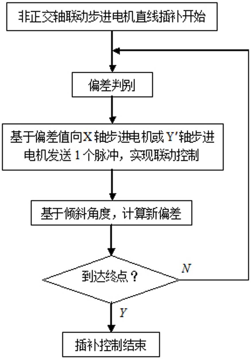 1.一种非正交轴联动步进电机直线插补控制方法,采用以下步骤:1)偏差判别、进给控制与新偏差计算,2)终点判别,其特征在于:步骤1)中,在XY正交坐标系中,将Y轴以原点O为基点逆时针旋转锐角α得到Y′轴,X轴和Y′轴组成非正交坐标系,X轴步进电机和Y′轴步进电机联动加工,设直线运动轨迹在第一象限,起点在原点O,终点E在XY坐标系下坐标为(xe,ye),对(ye/cosα+xe+ye·tanα)四舍五入得到进给总步数m,在运动起点处偏差F=0,已进给步数n=0;当偏差F≥0时向+X方向对X轴步进电机发出一个进给脉冲,进给后新偏差为(F-ye),已进给步数n增加1;当偏差F<0时向+Y′方向对Y′轴步进电机发出一个进给脉冲,进给后新偏差为(F+xe·cosα+ye·sinα),已进给步数n增加1;步骤2)中,判别插补是否结束,如果n=m则给X轴和Y′轴上的2个联动控制的步进电机发出停止插补控制指令,插补结束;如果n