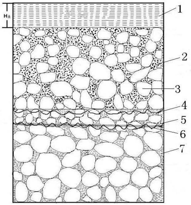 第四步,在第三步完成的基础上,继续充填煤矸石块至上覆表土层所需要的标高,并将壤质泥浆充填物或粉壤质泥浆充填物或粉质泥浆充填物或粉砂质泥浆充填物充入煤矸石块间的缝隙中,待泥浆填充物填充完毕后,将泥浆填充物和煤矸石块适当碾压平整;