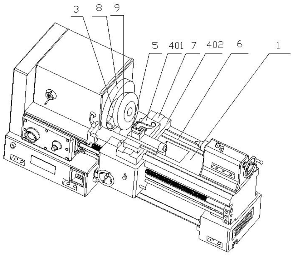 2)、将盆角齿轮坯(9)同轴夹装于分度装置(3)上,调整分度装置(3)与车床主轴(2)端面之间的倾斜度,使分度装置(3)中心轴线与车床主轴(2)端面之间的夹角为γ,且γ=