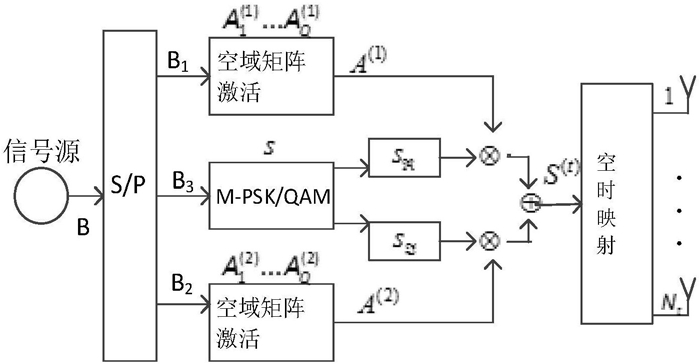 2)将信息比特B分为B1,B2,B3三个部分,根据 表示向下取整运算,得到B1,B2值,该值表示激活空域矩阵的比特数,lengthB3=log2M,得到B3的值,该值表示映射为调制符号s的比特数;调制后的实部信息比特 与B1从A选出的空间矩阵A(1)(2)相乘得到信号矩阵 虚部信息比特 与B2从A选出的空间矩阵A 相乘得到信号矩阵 将两个信号矩阵进行叠加得到传输信号矩阵S(t),即当A(1)=A(2)时S(t)的每一列S(t)column表示为公式(1), 代表激活的矩阵索引:
