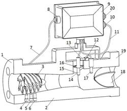 3.根据权利要求1所述的一种起旋器叶片磨损下的自调节式旋进旋涡流量计,其特征在于:所述的壳体(2)上还安装有温度传感器(17),穿过壳体(2)上设置的安装孔伸入到壳体(2)的内流道中,温度传感器(17)经温度信号传输线(23)连接到显示及处理装置(9)中。