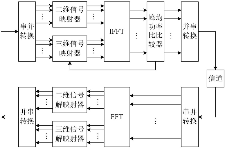 9.一种基于三维信号插入降低OFDM系统峰均功率比的系统,其特征在于,包含如下模块:发送端串并转换模块,用于处理信源产生的二进制数字信号,把串行的比特流转换为并行数据,其中每k=log2M比特一组作为索引信号输入映射器,M为所采用二维信号星座图的尺寸;