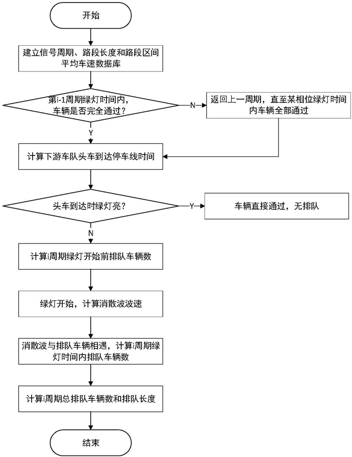 绿灯开始,消散波向上游传播,计算消散波波速,消散波结束时得到本周期绿灯时间内排队车辆数;根据本周期初始排队数、红灯排队数和绿灯排队数得到总排队车辆数;根据所述总排队车辆数和车头间距计算最大排队长度。