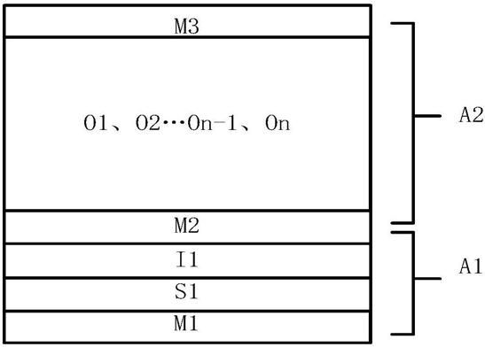 7.如权利要求1所述的电致发光器件,其特征在于,所述发光器件A2由电极M2,O1、O2、O3、O4、O5、O6构成的发光功能层和电极M3构成;其中O1为电极修饰层,O2为空穴注入层,O3为电子阻挡层,O4为发光层,O5为电子传输层,O6为电子注入层。