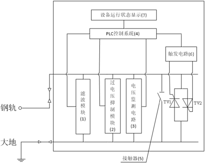 3.一种城市轨道交通供电系统钢轨电位限制装置的控制方法,装置包括PLC控制系统(4)和均与其连接的触发电路(6)和电压监测电路(3);触发电路(6)连接相互并联的第一晶闸管TV1和第二晶闸管TV2的控制极;还包括设置在钢轨与大地之间的接触器(5);接触器(5)的两端并联有过电压抑制模块(2);过电压抑制模块(2)连接PLC控制系统(4);还包括与PLC控制系统(4)连接的滤波模块(1);滤波模块(1)包括依次连接的滤波通信模块(1‑1)、滤波控制器(1‑2)和交流分量检测模块(1‑3);还包括均与滤波控制器(1‑2)连接的滤波器控制开关(1‑4)和滤波器(1‑5);滤波器控制开关(1‑4)连接滤波器(1‑5);滤波通信模块(1‑1)连接PLC控制系统(4);过电压抑制模块(2)包括依次连接的过电压抑制通信模块(2‑1)、过电压抑制控制器(2‑2)、过电压抑制控制开关(2‑3)和过电压抑制电路(2‑4);其特征在于,包括以下步骤:步骤1:实时监测获取钢轨电流和电位数据;