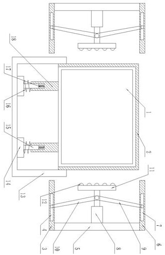 1.一种智能洗衣机的减振降噪装置,包括:洗衣机本体(1),其特征在于:还包括隔音罩(2)、下板(3)、下凹槽(4)、连接板(5)、上板(6)、上凹槽(7)、气压杆(8)、上连杆(9)、下连杆(10)、顶座(11)和防滑垫(12);所述洗衣机本体(1)的外表面上包覆有一个隔音罩(2);所述洗衣机本体(1)的两侧均设有一个下板(3);所述下板(3)中均设有一个下凹槽(4);所述下板(3)上均固定连接有一个连接板(5),所述连接板(5)与水平面相互垂直;所述连接板(5)上均固定连接有一个上板(6);所述上板(6)中均设有一个上凹槽(7);所述连接板(5)的内侧面上均固定连接有一个气压杆(8);所述气压杆(8)的另一端上均固定连接有一个顶座(11),所述顶座(11)均对准洗衣机本体(1);所述顶座(11)的外侧表面上均固定连接有数个防滑垫(12);所述气压杆(8)的活动端上分别铰接有上连杆(9)和下连杆(10);所述上连杆(9)的另一端滑动连接在上板(6)的上凹槽(7)中;所述下连杆(10)的另一端滑动连接在下板(3)的下凹槽(4)中;还包括缓冲座(13)、底座(14)、立杆(15)、第一弹簧(16)、第二弹簧(17)和凹座(18);所述缓冲座(13)的腔室中固定连接有两个底座(14);所述底座(14)上均固定连接有一个立杆(15);所述立杆(15)的外表面上均包覆有一个第一弹簧(16);所述立杆(15)上均滑动连接有一个凹座(18);所述凹座(18)与立杆(15)之间均固定连接有一个第二弹簧(17);所述洗衣机本体(1)滑动连接在缓冲座(13)中;所述凹座(18)固定连接在洗衣机本体(1)的下表面;所述隔音罩(2)的具体结构为:包括左固定座(19)、右固定座(20)、金属板(21)、第一隔音板(22)、第二隔音板(23)、吸音板(24)、阻火层(25)、真空层(26)和饰面板(27);所述金属板(21)的下表面固定连接有一个第一隔音板(22);所述第一隔音板(22)的下表面固定连接有一个第二隔音板(23);