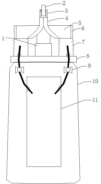 1.海上挖泥船,包括气缸(1)、铲轮(2)、轮架(3)、内隔板(4)、铲板(5)、外挡板(6)、波纹管(7)、基座(8)、抽泥泵(9)、船体(10)和储泥仓(11),其特征是:所述船体(10)上安装储泥仓(11),船体(10)头部安装基座(8),基座(8)前端安装气缸(1),气缸(1)的伸缩杆前端安装两个内隔板(4),内隔板(4)外侧壁安装在一起,内隔板(4)前端安装轮架(3),铲轮(2)的轴安装在轮架(3)上,内隔板(4)安装在铲板(5)上,铲板(5)另一侧安装外挡板(6),外挡板(6)、内挡板和铲板(5)的后侧安装波纹管(7),波纹管(7)的另一端安装在基座(8)上,抽泥泵(9)的抽泥管从基座(8)内部穿到波纹管(7)内,抽泥管通过管道固定件安装在波纹管(7)内,抽泥泵(9)的排泥管通过管道固定件通入到储泥仓(11)内。
