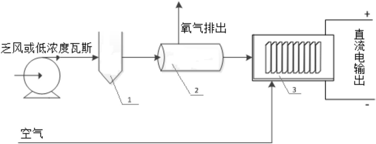 1.一种利用乏风或低浓度瓦斯的直接发电方法,其特征在于,首先经矿井通风机排出的乏风或瓦斯抽采真空泵抽采的低浓度瓦斯进入除尘脱硫装置(1)进行脱硫除尘预处理,预处理后的乏风或低浓度瓦斯接着被输送至气体分离装置(2)除去部分氧气,除去部分氧气后的乏风或低浓度瓦斯接着进入固体氧化物燃料电池(3)的阳极气道参与电化学反应,同时向固体氧化物燃料电池(3)的阴极气道输送外界空气参与电化学反应,固体氧化物燃料电池(3)向外界输出直流电实现将乏风或低浓度瓦斯的化学能直接转化为电能;所述除尘脱硫装置(1)将乏风或低浓度瓦斯中的硫化氢气体含量降低至10ppm以下,将乏风或低浓3