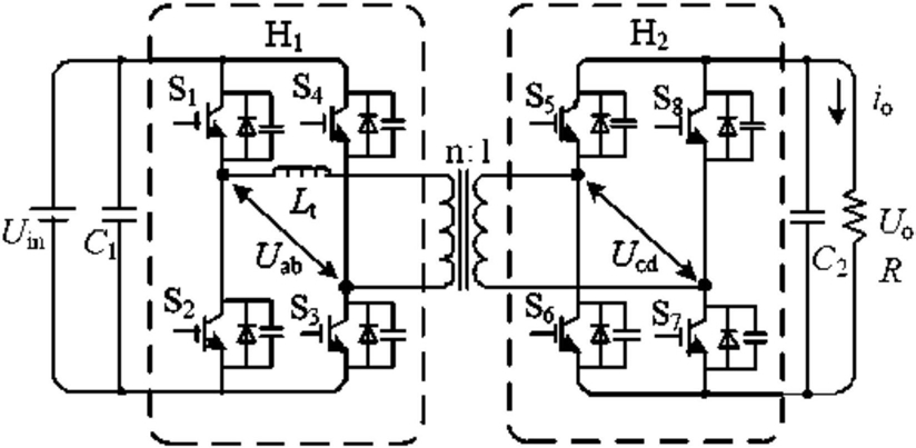 1.一种双有源全桥DC-DC变换器的电流应力优化双相移控制方法,其特征在于,包括:S1:根据双有源全桥DC-DC变换器输出电压的平均模型,构建变换器输出电压的状态平均空间方程:其中,C2为输出侧电容,Uo为输出电压,f为开关频率,L为辅助电感,R为负载电阻,Uin为变换器的输入电压,D1、D2分别为变换器在双重相移控制下的内相移量和外相移量;