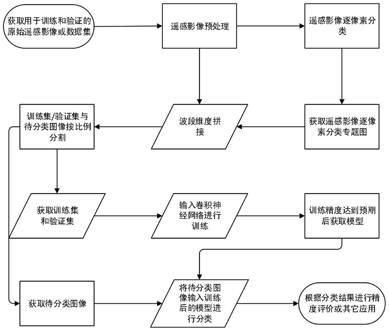 所述拼接的具体方法为:通过在遥感图像N个波段之后加入一个新波段,当原场景图或从遥感图像上切割的输入场景图大小为n×n×b,其中n为图的宽度和高度,b为波段数;逐像素分类专题图为n×n×1;两图在波段维度进行拼接,拼接后的图片为n×n×(b+1);