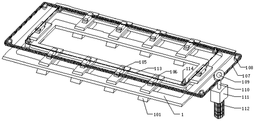 所述传动块(105)相互平行的两个侧面上各设置有一个与传动皮带(107)相配合的凹槽,所述传动皮带(107)通过第一定滑轮(108)在水平面内围成与主滑轨(1)的矩形状轨道相平行的矩形状闭合皮带圈;所述矩形状闭合皮带圈的内圈卡入传动块(105)一侧面设置的凹槽内,通过传动皮带(107)带动第一滑块(101)在主滑轨(1)上滑动;