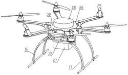 无人机包括第一起落支架、第二起落支架、上水平板和下水平板,下水平板固定设置在第一起落支架和第二起落支架的顶部,方箱位于第一起落支架和第二起落支架之间,方箱顶部与下水平板下表面接触并通过第一连接螺栓紧固连接,下水平板中部通过沉头螺栓与安装板固定连接,下水平板和安装板上开设有穿线孔,控制器的电源线向上通过穿线孔与无人机的电源连接;