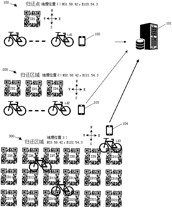 (1)管理服务器建立归还点或区域ID数据库,所述ID数据库中还包括每个归还点或区域的最大容量数及其地理位置信息,并将所述ID标识以二维码在对应归还点或区域的物理位置公示;